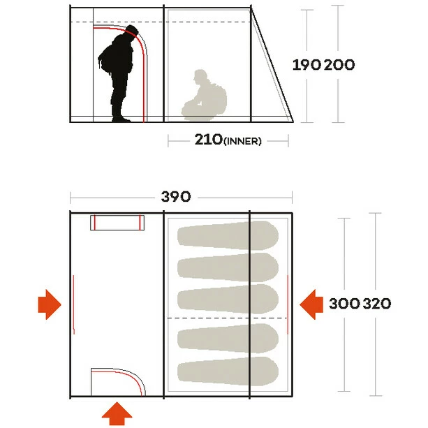 - Inner tent floor material: 70D, 80 g/m² polyester, waterproof up to 2.5 mm