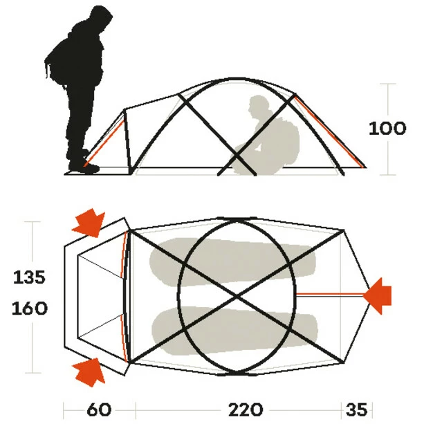 - Adhesive tape loops on the ground corners to secure the tent when pitched on snow, with ice axes, skis or other anchors